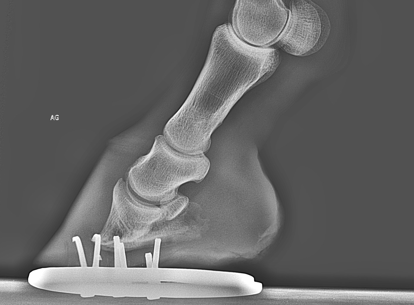 La première est une radio d'un pieds sain, la 3ème phalange, partie de l'os du pieds faisant un triangle, est bien parallèle au sol. Sur la deuxième radio, un pieds ferré de Texan, on remarque bien que la 3ème phalange n'est pas parallèle au sol et est de plus, courbée.