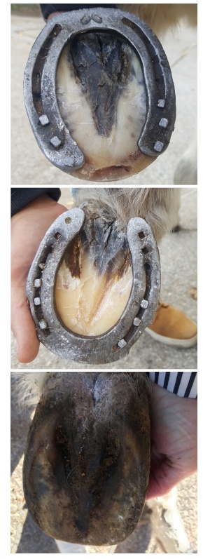 Pour Texan, le maréchal et le vétérinaire ont décidé que le mieux était de le ferré à l'envers, ce qu'on peut voir sur la première image. Il les a gardé pendant 3 mois aux postérieurs et 6 mois pour les antérieurs. Une fois que la phalange ait repris un angle correcte, le maréchal lui a remis les fers à l'endroit, 2ème image et ensuite une fois que le pieds était suffisamment fort on l'a mit pieds nu, dernière image.